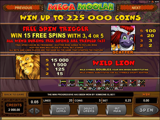 Det er imidlertid gode muligheter til å vinne penger her selv om du ikke får jackpot, takket være verdifulle symboler som løve og elefant og de innbringende free spins du får av den kloke apen. Merk at det ikke går an å spille Mega Moolah gratis, her må du våge å satse litt.